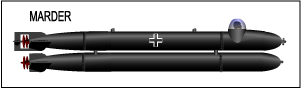 Le Marder tait simplement une extrapolation du Neger. Contrairement au premier, limité à la surface, le Marder pouvait plonger à 40 mètres. Ceci lui permettait d'échapper à un " prédateur " éventuel ou tout simplement au gros temps. 500 unités furent produites, jusqu'en mai 1945. Là encore, les commandes étaient réduites au maximum, seules quelques graduations sur le cockpit et une tige à l'avant du nez permettaient de viser le navire ennemi en vue. Le stress à bord était considérable et beaucoup de pertes furent dues à des causes étrangères au combat : Epuisement physique, désespérance et renoncement, empoisonnement au dioxyde de carbone ou simplement un temps exécrable ( la plupart des volontaires n'étaient même pas des marins ). Leur première sortie fut tentée la nuit du 2-3 août 1944 depuis Houlgate et les 58 Marder coulèrent le destroyer d'escorte HMS Quail, un dragueur de mines, un LST, un liberty-Ship et un autre transport de 7000 tonnes et endommagèrent un croiseur. Cependant la contre-attaque alliée fut vigoureuse et seulement 17 unités rentrèrent à bon port. Ce taux de pertes - qui n'allait pas s'améliorer par la suite - allaient vite faire de ces unités, qui devaient en principe rentrer à leur base après l'action, de véritables " cercueils ", et les volontaires se firent moins nombreux. Une autre action fut tentée les 16-17 août par une attaque de 42 Marder qui s'en prirent au vieux cuirassé Français échoué Courbet ( encaissant deux torpilles, sans grandes conséquences ), et coulant le petit vapeur guide-ballon HMS Fratton et un transport. 26 Marder furent perdus durant cette attaque. Enfin en septembre 1944 une autre " K-Verbänd " de 30 unités s'en prit à la flotte alliée de débarquement. Aucune victoire ne fut enregistrée et en même temps 17 unités furent perdues en mer, les autres qui avaient survécu à la mission et hissées à sec, étant détruites par un bombardement côtier à Vertimiglia. Dimensions 8,30 x 0,53 m 3-Hai : C- Autres types de projets de submersibles de poche : 1-Delphin : 2-Seeteufel : 3-Schwertval : |