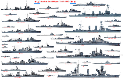 Seconds projets: Au titre du plan de 1943-47, et revu pour le plan de 1950-56, les trois grands croiseurs de bataille de la classe Stalingrad, vit leur construction reportée aux années 50 et finalement furent démolis, priorité ayant été donnée à des navires plus raisonnables et modernes après la mort de Staline. -Croiseurs: En 1941, la flotte comprenait 8 croiseurs, les plus anciens étant le Komintern (ex-Pamiat Merkurya, 1904), navire-école; l'Aurora très célèbre, car avant d'avoir été conservé comme musée flottant de la révolution à partir de 1948, il fut remis en service en 1923, en tant que navire-école des cadets jusqu'en 1931, et resta en rade à Leningrad, jusqu'à l'invasion, bombardé par la Luftwaffe puis sabordé pour éviter d'être capturé. Il fut renfloué en 1944 et réparé, remis dans son état initial de 1917. Il est toujours visitable et constitue l'une des attractions touristiques Kitsch de Leningrad aujourd'hui. Plus récents et donc de valeur militaire plus évidente, les croiseurs de la classe Svetlana, construits à partir de 1913 et d'une première classe qui devait comprendre 6 unités, subit les vicissitudes du conflit et seules les trois unités les plus avancées entrèrent en service, le Chevronya Ukraina (ex-Admiral Nakhimov) en 1927, le Krasny Krim (ex-Profintern, ex-Svetlana) en 1928, et le Krnasny Kavkaz (ex-Admiral Lazarev) en 1932. ce dernier, complètement reconstruit, n'avait plus rien à voir avec les deux autres. Les deux premiers avaient un valeur militaire toute relative de par leur conception surannée. Les croiseurs les plus efficaces et les plus récents de la marine Russe étaient ceux de la classe Kirov et Maxim Gokiy. les premiers avaient étés construits comme les seconds en Union soviétique, mais leur conception était presque intégralement Italienne. De fait, ils rappellent certains navires de cette marine. Toutefois ils comportent certains particularismes comme l'adoption pour l'artillerie principal de tourelles triples de 180 mm, configuration inusitée ( standard 203 mm - ou 8 pouces, de croiseurs lourds ou 152 mm - ou 6 pouces, de croiseurs légers). Mais par leur tonnage et la comparaison avec des unités plus anciennes, ils entrent dans la catégorie des croiseurs lourds. Les deux Kirov étaient terminés en 1938 et 1940, le Maxim Gorkiy en 1940 et le Vyacheslav Molotov en juin 1941, le 6, presque 15 jours avant l'invasion Allemande (22 juin). Les deux autres unités de la classe, le Kaganovitch et le Kalinin, ne seront prêts qu'en 1943 et 1944. Enfin, les croiseurs de la classe Chapayev, mis en chantier en 1938-39-40, lancés en 1940 pour les premiers, ne seront terminés que bien après la guerre.